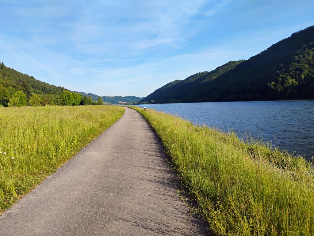 Fortunately a mile down from my makeshift campsite there was a bridge bicyclists can cross river to get on the other side of the river and continue down the path. Can tell how good the path is by all of the people of all ages out there with two panniers bags full and some with sleeping bags. Electric bikes are heavily used. It seems that 90% of the trail is flat. The one thing that make me uncomfortable is on the narrower roads there is not a lot of room for cars to pass you.